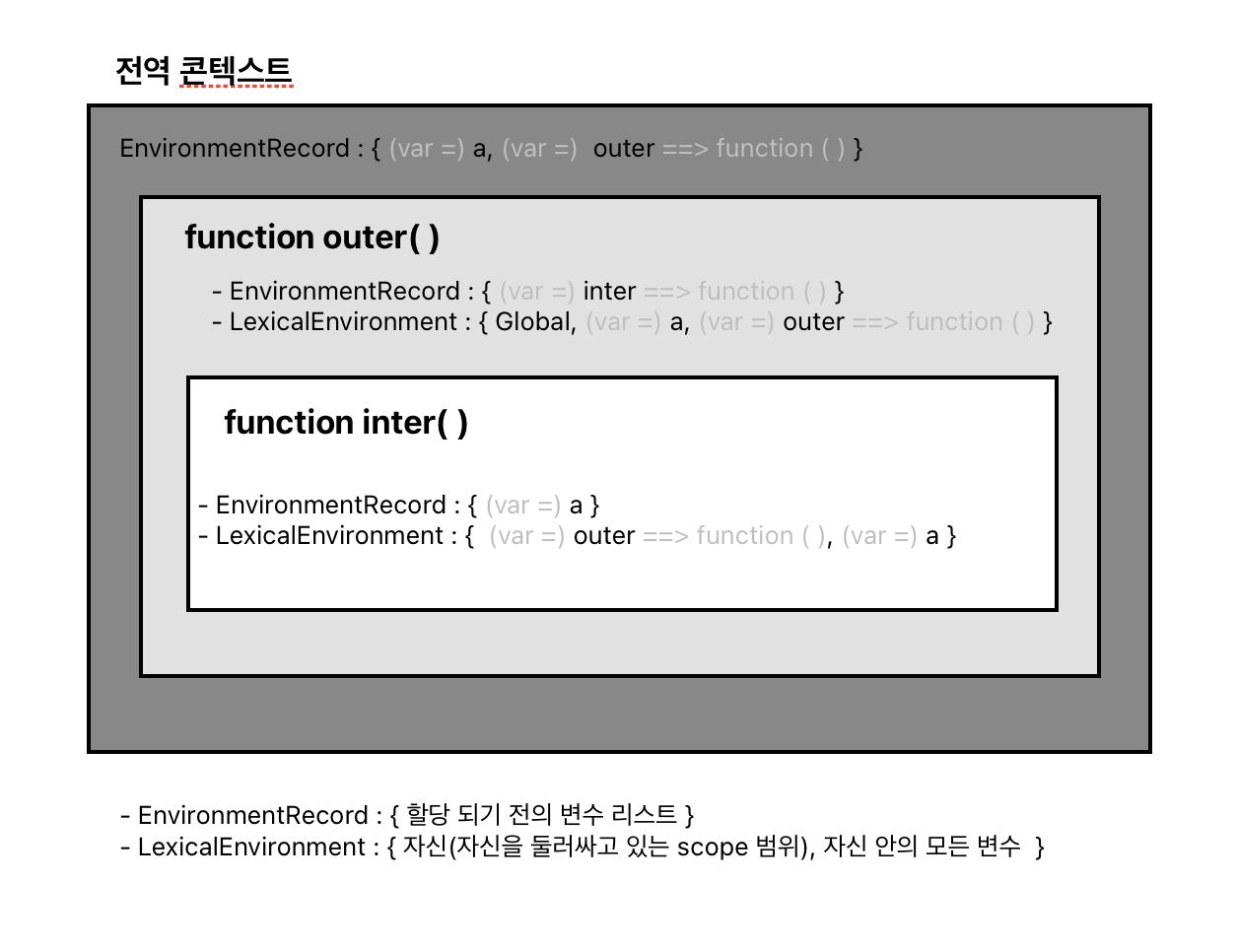 VariableEnvironment와 LexicalEnvironment는 매개변수명, 변수의 식별자, 선언한 함수명 등을 수집하는 environmentRecord와 바로 직전 콘텍스트 LexicalEnvironment 정보를 참조하는 outerEnvironmentaReference로 구성.