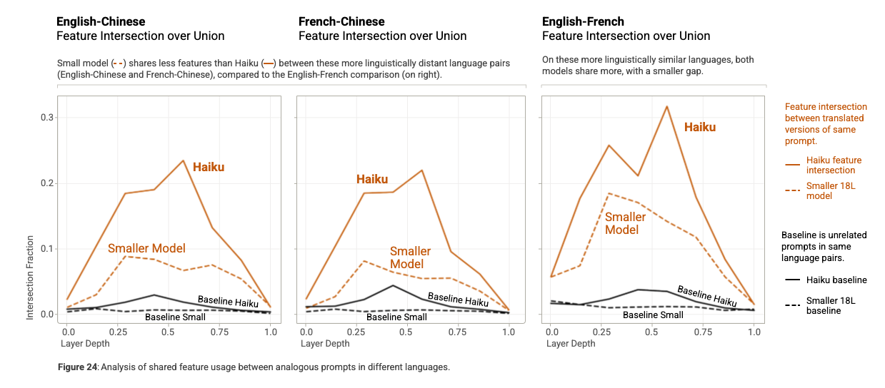 To test this, we collect feature activations on a dataset of paragraphs on a diverse range of topics, with (Claude-generated) translations in French and Chinese. For each paragraph and its translations, we record the set of features which activate anywhere in the context. For each {paragraph, pair of languages, and model layer}, we compute the intersection (i.e., the set of features which activate in both), divided by the union (the set of features which activate in either), to measure the degree of overlap. As a baseline, we compare this with the same "intersection over union" measurement of unrelated paragraphs with the same language pairing.
