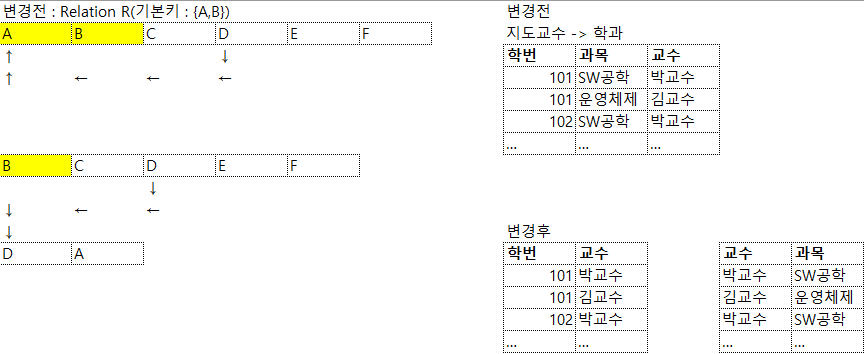 - A가 부분 기본키인데, BCNF가 발생하면 B만 기본키로 남기때문데 다시 Table과 Attribute의 속성을 대해 재구성 여부 확인에 들어간다.